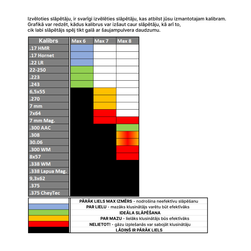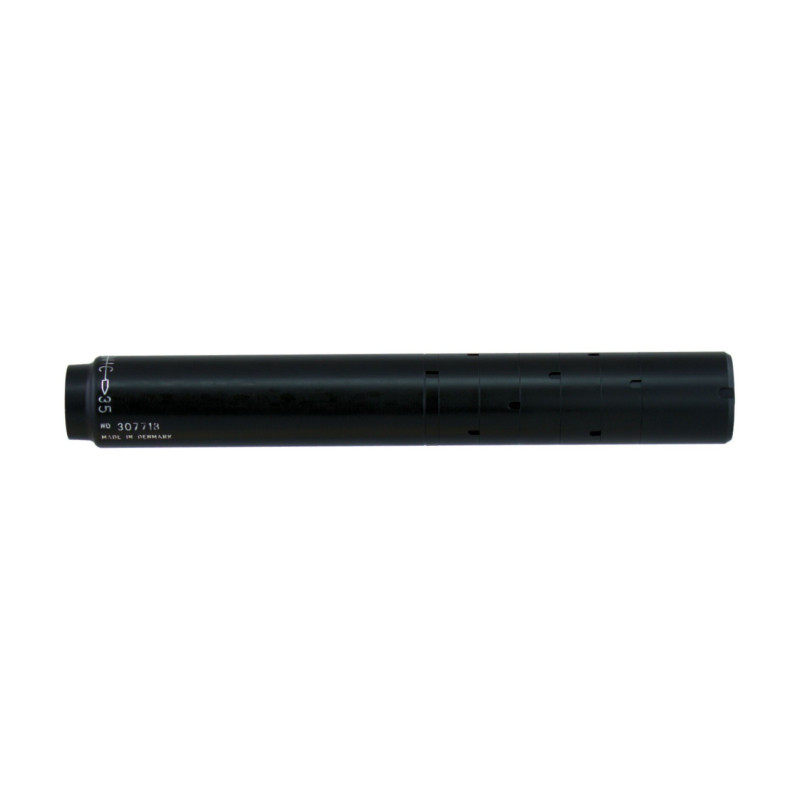 Šī trokšņa slāpētāja diametrs ir tikai 35 mm. Tā kā mazākiem kalibriem nav nepieciešams liels skaļums optimālai slāpēšanai, varat samierināties ar šo mazo un plāno trokšņa slāpētāju. Mēs iesakām izmantot šo amortizatoru līdz .243 Winchester ieskaitot.