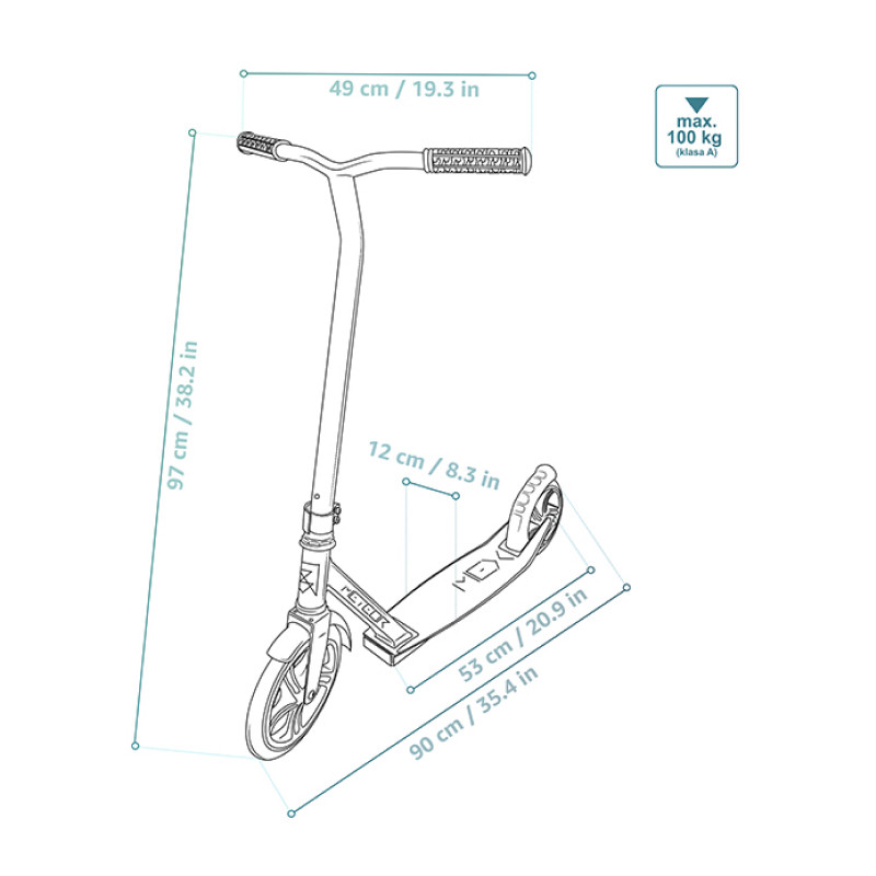 Stūre ir aprīkota ar gumijas rokturiem, nodrošinot roktura satvērienu. Liela, zema platforma atvieglo līdzsvaru, lai arī iesācēji justos pārliecinātāki.